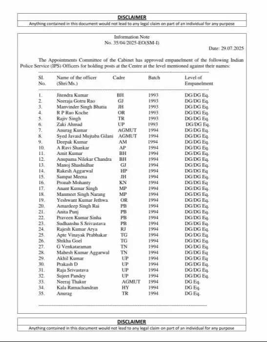 केंद्र सरकार ने 29 जुलाई 2025 को 35 वरिष्ठ भारतीय पुलिस सेवा (IPS) अधिकारियों को DG (डायरेक्टर जनरल) अथवा DG समकक्ष स्तर पर इम्पैनल कर दिया है। यह निर्णय अपॉइंटमेंट्स कमेटी ऑफ द कैबिनेट (ACC) द्वारा लिया गया है।