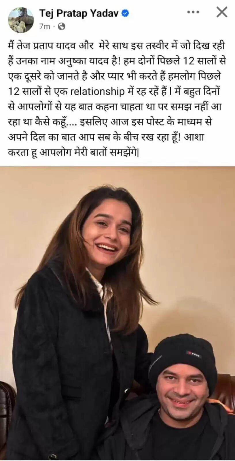 तेज प्रताप ने फेसबुक पर लिखा था, "मैं तेज प्रताप यादव और मेरे साथ इस तस्वीर में जो दिख रही हैं उनका नाम अनुष्का यादव है। हम दोनों पिछले 12 सालों से एक-दूसरे को जानते हैं और प्यार भी करते हैं। हमलोग पिछले 12 सालों से रिलेशनशिप में हैं। मैं बहुत दिनों से आप लोगों से यह बात कहना चाहता था पर समझ नहीं आ रहा था कैसे कहूं। इसलिए आज इस पोस्ट के माध्यम से अपने दिल की बात आप सब के बीच रख रहा हूं। आशा करता हूं आपलोग मेरी बातों को समझेंगे।"