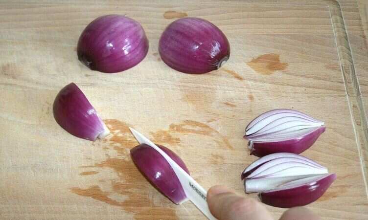 3 ध्यान रखें कि प्याज को काटते समय उसको ऊपरी भाग से नहीं बल्कि जड़ की तरफ से काटें. प्याज काटने के लिए तेज धार वाले चाकू का इस्तेमाल करें जिससे प्याज फटाफट कट जाए।