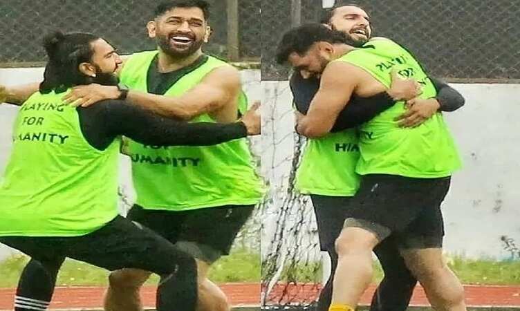सोशल मीडिया पर इन दोनों हस्तियों की फुटबॉल प्रैक्टिस करते हुए कुछ तस्वीरें वायरल हो रही हैं, जिसमें धोनी और रनवीर एक-दूसरे से गले मिलते दिख रहे हैं.