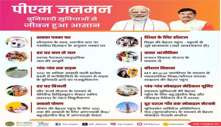PM Janman Yojana: मुख्यमंत्री डॉ. मोहन यादव की अध्यक्षता में मंत्रि-परिषद की बैठक मंत्रालय में हुई। मंत्रि-परिषद द्वारा विशेष रूप से कमजोर जनजातीय समूहों के सामाजिक और आर्थिक कल्याण के लिए शुरू की गई प्रधानमंत्री जनजातीय आदिवासी न्याय महाअभियान (पीएम-जनमन) के तहत प्रदेश में विभिन्न विकास कार्यों के क्रियान्वयन की स्वीकृति दी। मंत्रि-परिषद द्वारा प्रदेश में विशेष पिछड़ी जनजातीय क्षेत्रों के 23 जिलों में नए आंगनवाड़ी केन्द्रों, छात्रावासों, बहुउद्देश्यीय केंद्रों, सड़कों और आवास निर्माण की स्वीकृति दी गई। मंत्रि-परिषद द्वारा "सक्षम आंगनवाड़ी एवं पोषण 2.0" योजना अंतर्गत विशेष जनजाति क्षेत्रों में पीएम-जनमन कार्यक्रम हेतु 194 नवीन आंगनवाड़ी केन्द्रों की स्थापना एवं संचालन हेतु स्वीकृति दी गई है। भवनों का निर्माण जनजातीय परिवेश आधारित डिजाईन अनुसार ग्राम पंचायत द्वारा किया जावेगा। विशेष पिछड़ी जनजाति क्षेत्रों के ऐसे मजरे टोले जिनकी जनसंख्या 100 या अधिक है और जहाँ आंगनवाड़ी केन्द्र नहीं है, वहाँ नए केन्द्र खोले जाएगे।