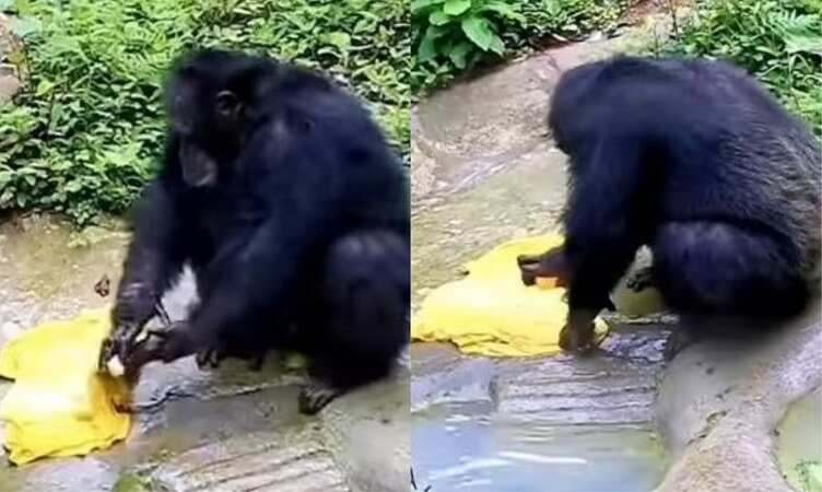 चिंपैंजी ने साबुन लगाकर रगड़-रगड़ के धोए कपड़े, वीडियो देखकर हंसते-हंसते लोटपोट हो गई जनता