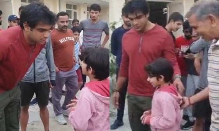 वीडियो में आप देख सकते हैं कि हरियाणा के पानीपत स्पोर्ट्स स्टेडियम में नीरज अपनी टीम के साथ दिखाई दे रहे हैं. इस दौरान ही उनके पास एक बच्चा आता है जिससे वह बहुत प्यारे तरीके से बात करते हैं. फिर नीरज किसी की चर्चा करते हुए बच्चे से कहते हैं कि आपने सुना है उसका नाम जिस पर बच्चा मना कर देता है. इसके बाद नीरज कहते हैं कि उसको सर्च करना आप, है ना. फिर अचानक से बच्चा कहता हैं कि 'मेरे फेवरेट को आप ही हो'. जिस पर नीरज मुस्करा देते हैं. फिर इस बच्चें के द्वारा बनाई गई पेंटिंग नीरज देखने के लिए चले जाते हैं. नीचे देखें वी़डियो...